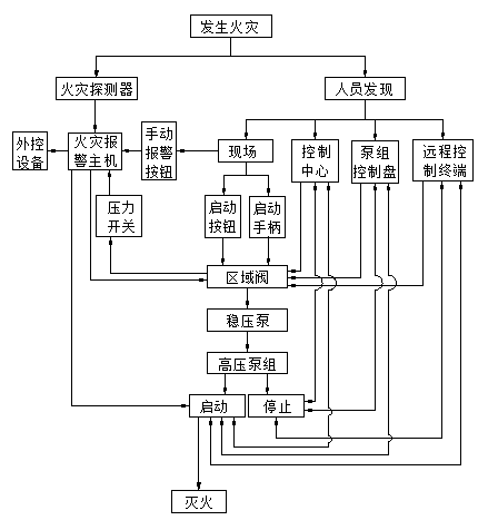 圖2是高壓細(xì)水霧滅火系統(tǒng)的工作原理圖:在監(jiān)視狀態(tài)下,高壓細(xì)水霧系統(tǒng)從泵組單向閥出口至分區(qū)控制閥前的管網(wǎng)內(nèi)(閉式至噴頭管網(wǎng))維持在1.0~1.2MPa。當(dāng)該管網(wǎng)內(nèi)壓力低于1.0MPa時(shí),穩(wěn)壓泵啟動(dòng),使該管網(wǎng)內(nèi)的壓力達(dá)到1.2MPa,當(dāng)穩(wěn)壓泵運(yùn)行超過(guò)10秒后壓力仍沒(méi)有達(dá)到1.2MPa,主泵啟動(dòng),穩(wěn)壓泵停止。主泵可分別通過(guò)火災(zāi)報(bào)警控制器、現(xiàn)場(chǎng)手動(dòng)按鈕、現(xiàn)場(chǎng)機(jī)械應(yīng)急手柄、手動(dòng)報(bào)警按鈕、控制中心、泵組控制盤、遠(yuǎn)程控制終端共七種方式間接啟動(dòng)。