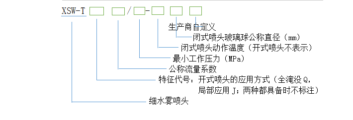 高壓細(xì)水霧噴頭型號(hào)由產(chǎn)品類別、產(chǎn)品代號(hào)、主參數(shù)、自定義代號(hào)等組成。